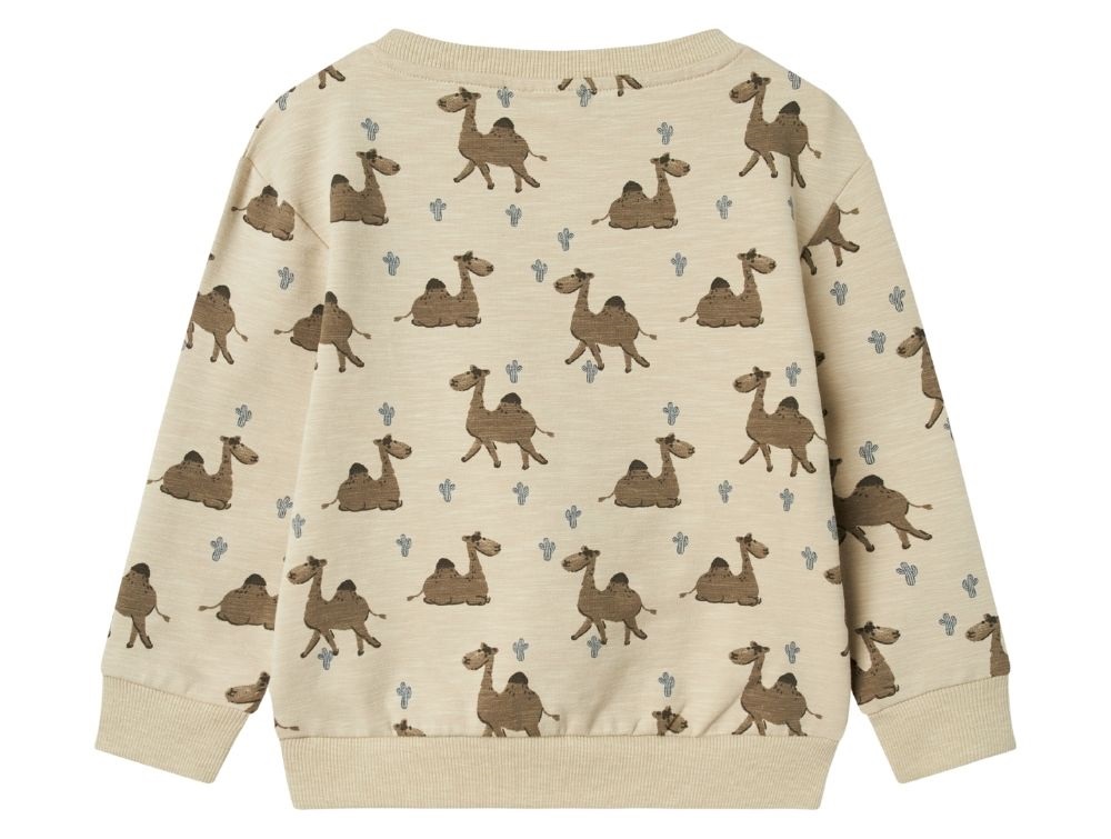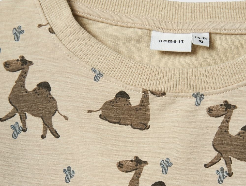 Dreng klædt i beige sweatshirt med dromedarprint fra Name It 13243307 peyoteBeige sweatshirt med dromedarprint fra Name It 13243307 peyoteBeige sweatshirt med dromedarprint fra Name It 13243307 peyote bagfraPrint af dromedarer på beige sweatshirt fra Name It 13243307 peyote