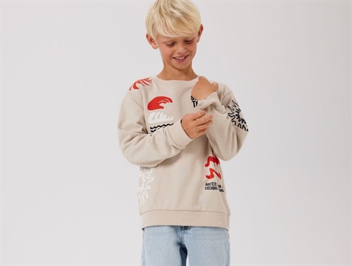 Dreng klædt i beige sweatshirt med sort, rødt og hvidt print og broderi fra Name It 13244172 peyoteBeige sweatshirt med sort, rødt og hvidt print og broderi  fra Name It 13244172 peyoteBeige sweatshirt bagfra med sort, rødt og hvidt print og broderi fra Name It 13244172 peyoteSort, rødt og hvidt print og broderi på beige sweatshirt fra Name It 13244172 peyote