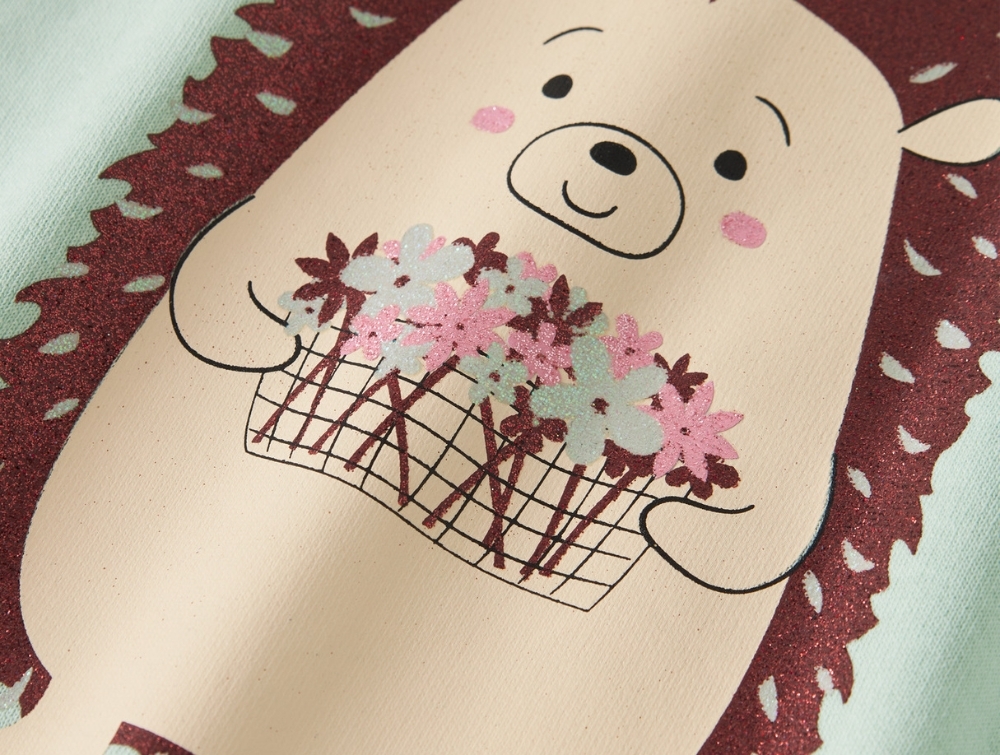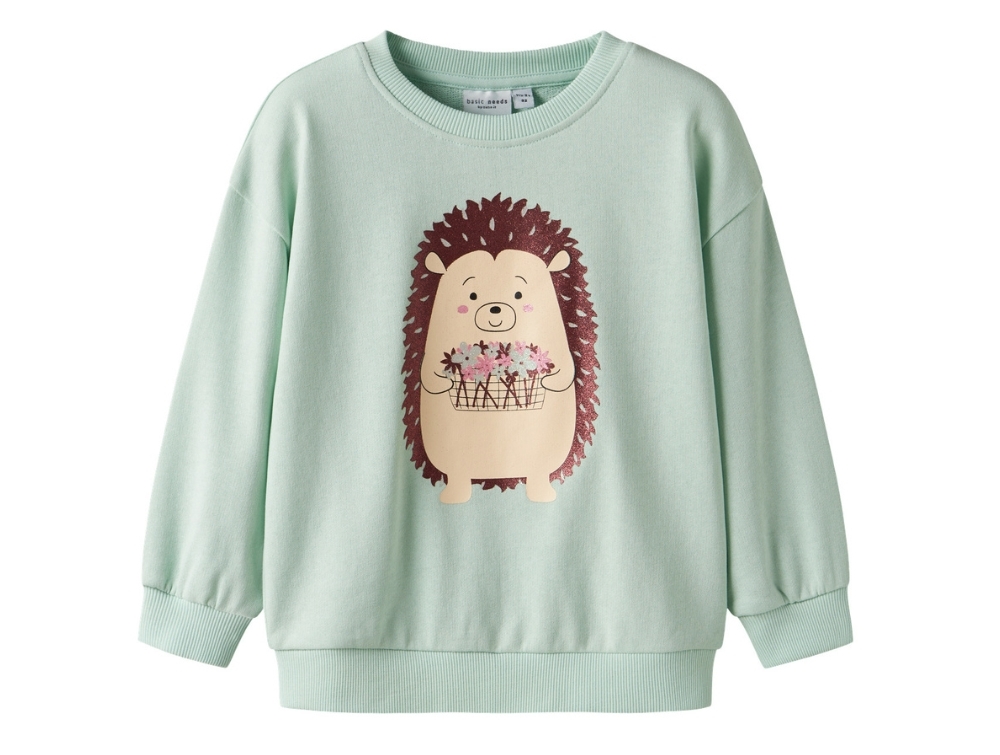 Sweatshirt i mintgrøn nuance fra Name It med sødt print af et pindsvin, der holder en kurv med blomster. Printet har fine glimmereffekter, der giver et legende udtryk.