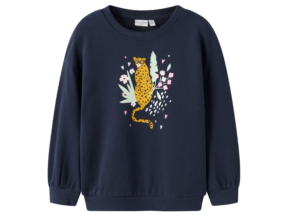Sweatshirt i mørkeblå nuance fra Name It med flot print af en gepard omgivet af blomster og blade. Den bløde kvalitet i 100% bomuld giver en behagelig fornemmelse mod huden, og den afslappede pasform gør den ideel til hverdag.