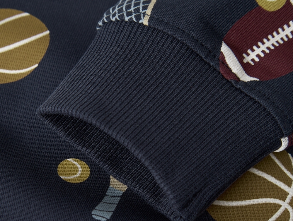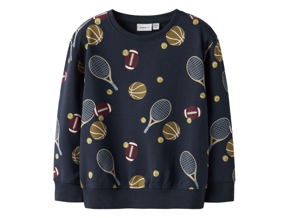 Sweatshirt i mørkeblå nuance fra Name It med sporty print af tennisbolde, basketballs og ketsjere. Den bløde sweatkvalitet er lavet af økologisk bomuld med stræk, som giver en behagelig pasform og god bevægelsesfrihed.