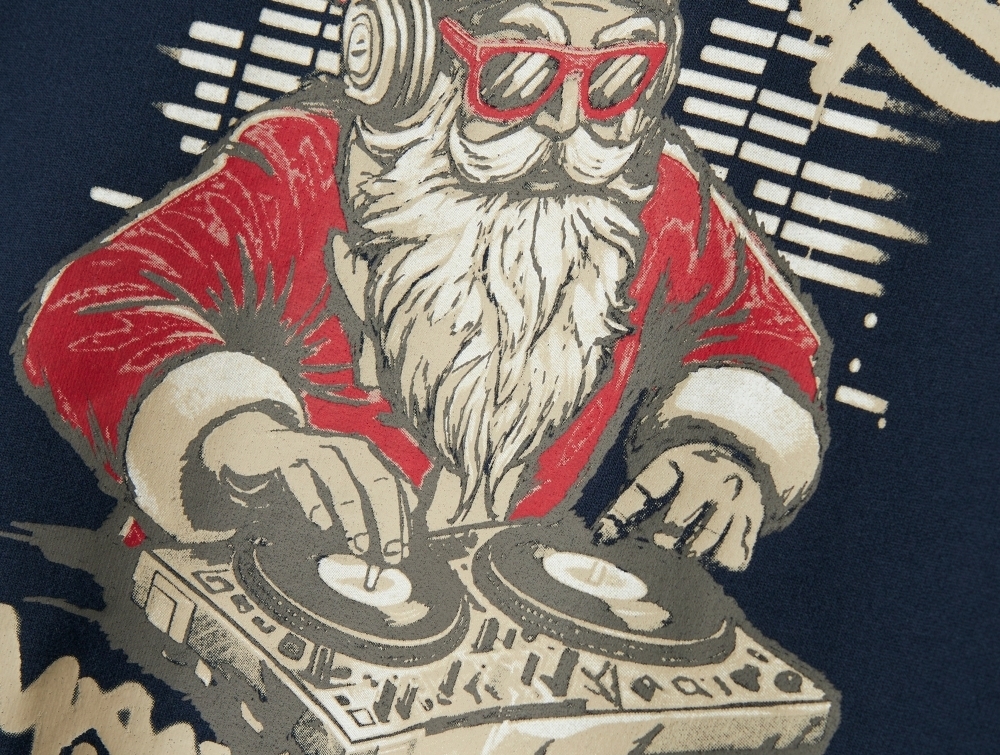 Foran ses et stort print af julemanden som DJ ved et mixerpult, mens ærmer og ryg har graffiti-inspireret skrift.