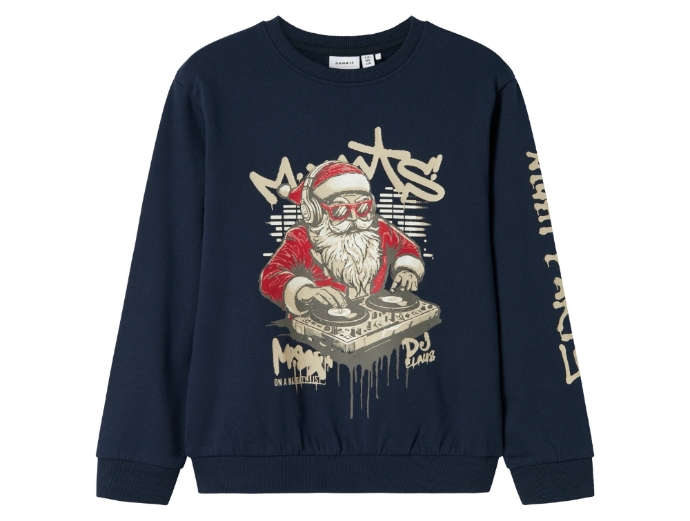 Name It sweatshirt i navy blazer med julemand DJ printDreng iført Name It sweatshirt i navy blazer med julemand printDetalje af julemand DJ print på Name It sweatshirtBagside af Name It sweatshirt navy blazer med graffiti print
