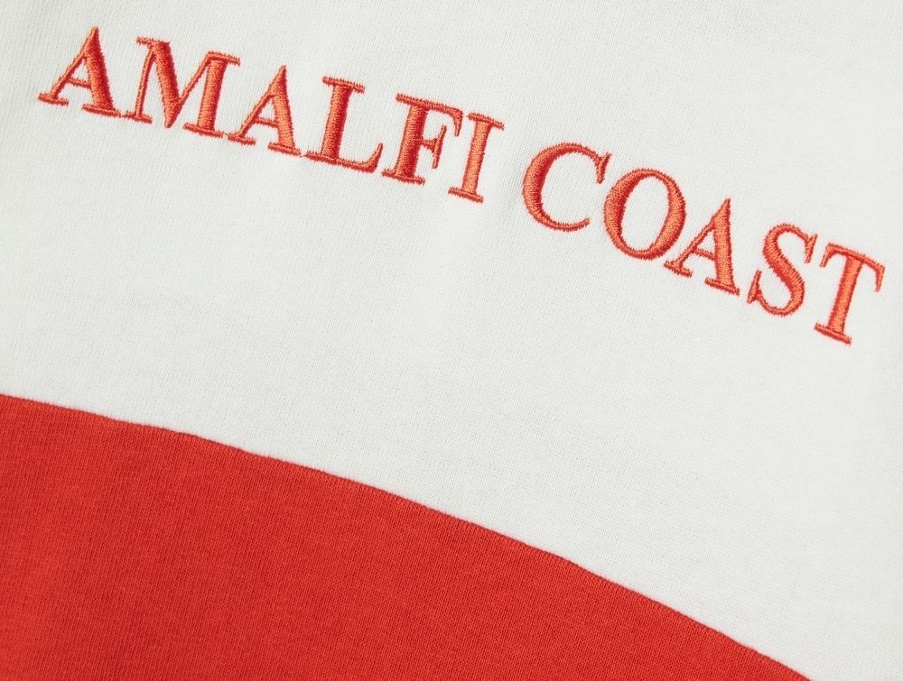 Cool sweatshirt i orangerød med brede hvide striber og teksten 'Amalfi Coast' broderet på brystet. Modellen har rund hals, korte ærmer og ribkanter. Lavet i en ubørstet sweatkvalitet med glat overflade, som gør den behagelig at have på. Perfekt til et afslappet og moderne hverdagslook.