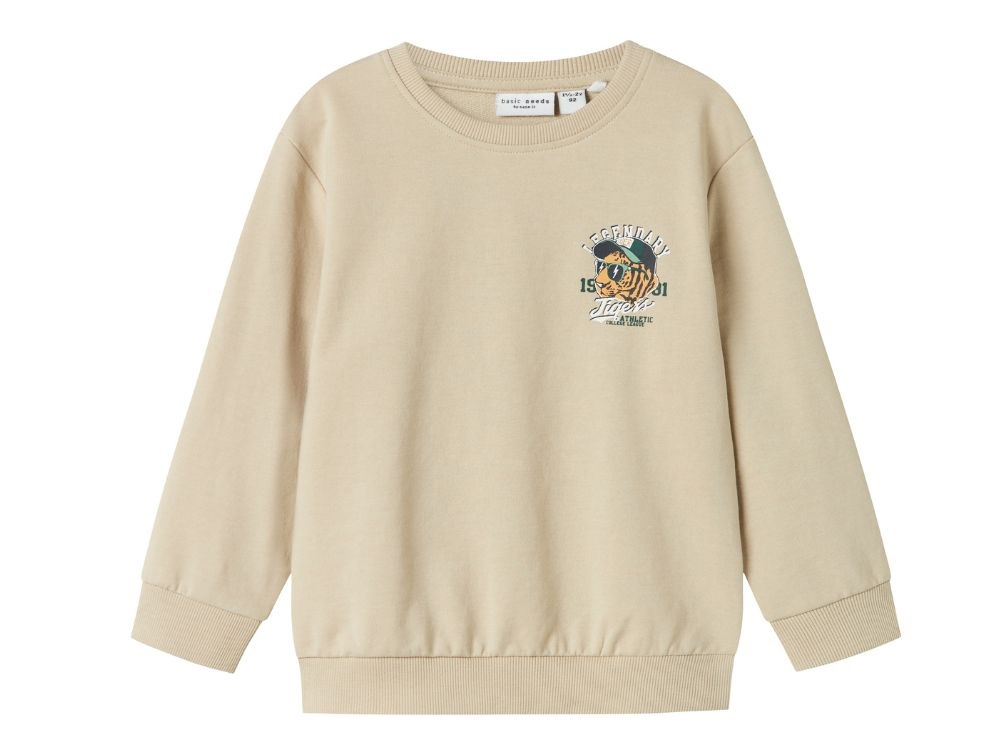 Sweatshirt i beige (peyote tiger) fra Name It med sejt tigerprint foran.