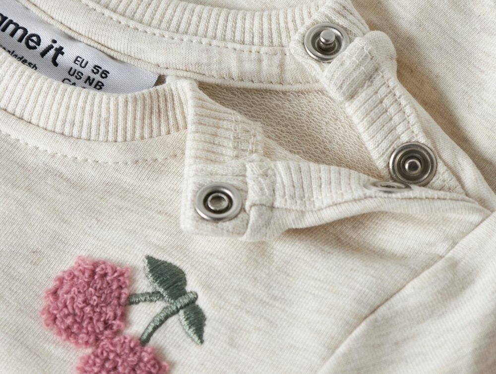 Name It sweatshirt i beige nuance med kirsebærbroderiName It sweatshirt i beige nuance med trykknapper ved skulderName It sweatshirt i beige nuance set bagfra