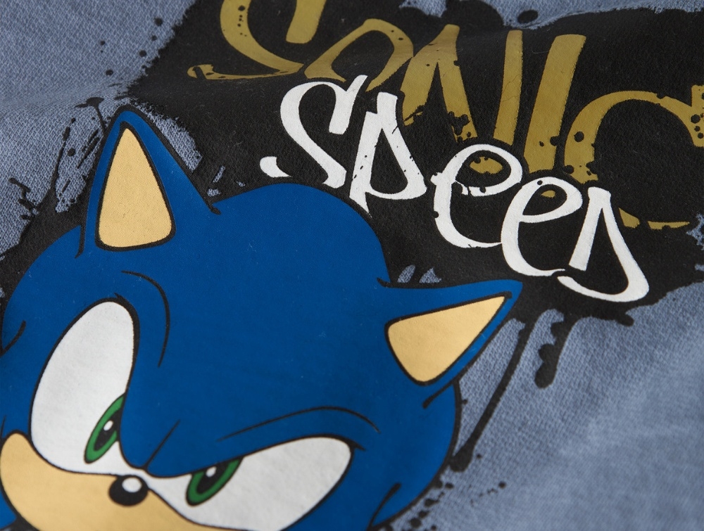 Designet har almindelig pasform med print af Sonic både foran og på ryggen, hvilket giver et gennemgående grafisk udtryk.