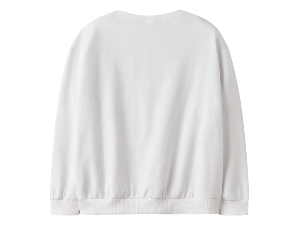 Pige iklædt Name It sweatshirt i hvid med Stitch printName It sweatshirt bright white med Disney Stitch motivName It sweatshirt bright white detalje af Stitch printName It sweatshirt bright white set bagfra