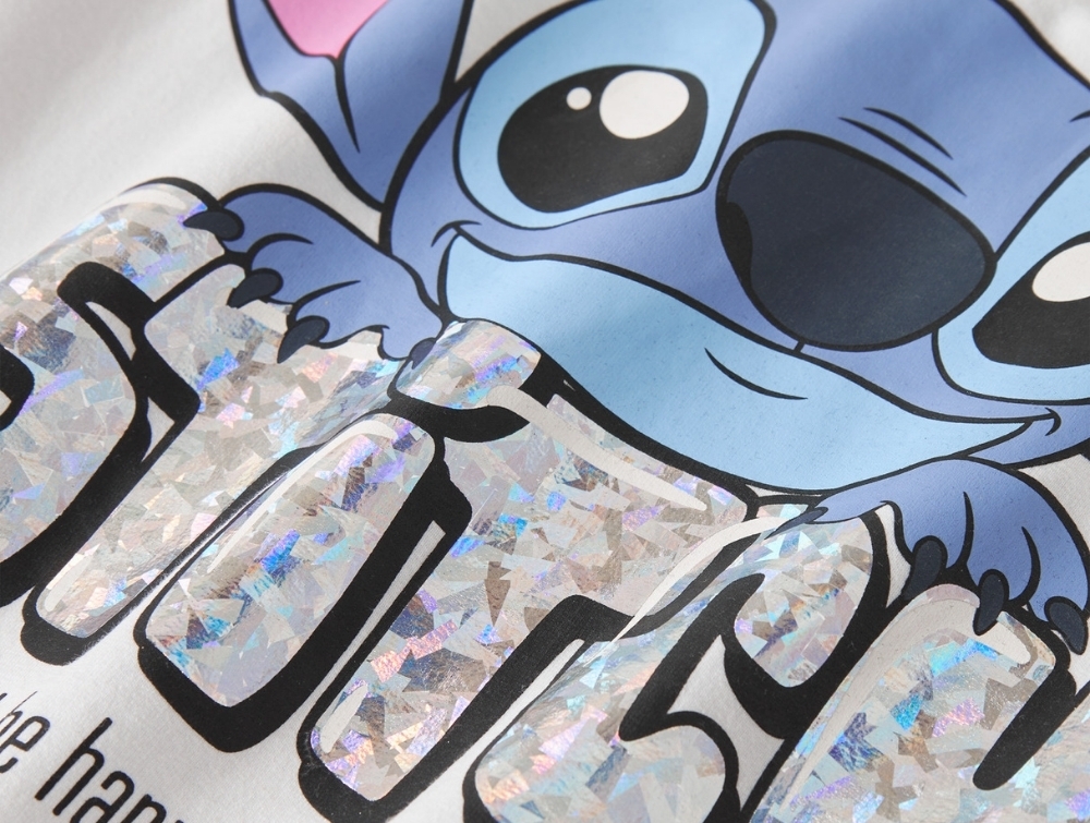 Designet har rund hals og lange ærmer med ribkant ved hals, ærmer og bund. Stitch er kendt fra Disney-filmen Lilo & Stitch og er en energisk figur, der lærer om venskab, familie og at være sig selv.