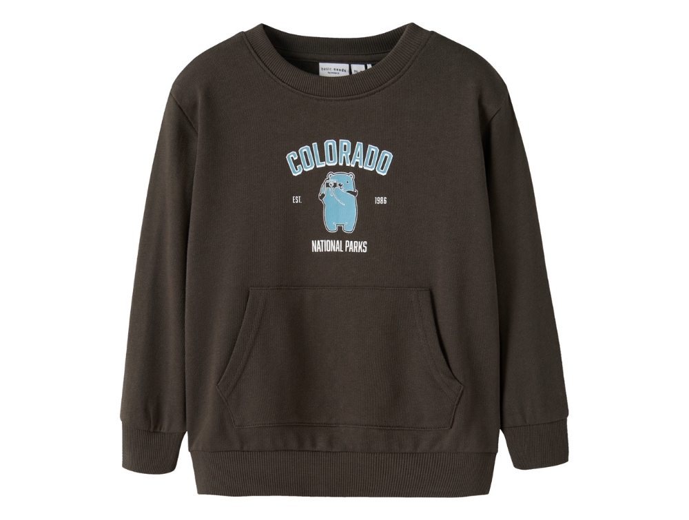 Sweatshirt i brun nuance fra Name It med print af teksten “Colorado National Parks” og en sød blå bjørn på fronten. Den har en klassisk kængurulomme og er lavet i blød bomuldskvalitet med rund hals og ribkanter.