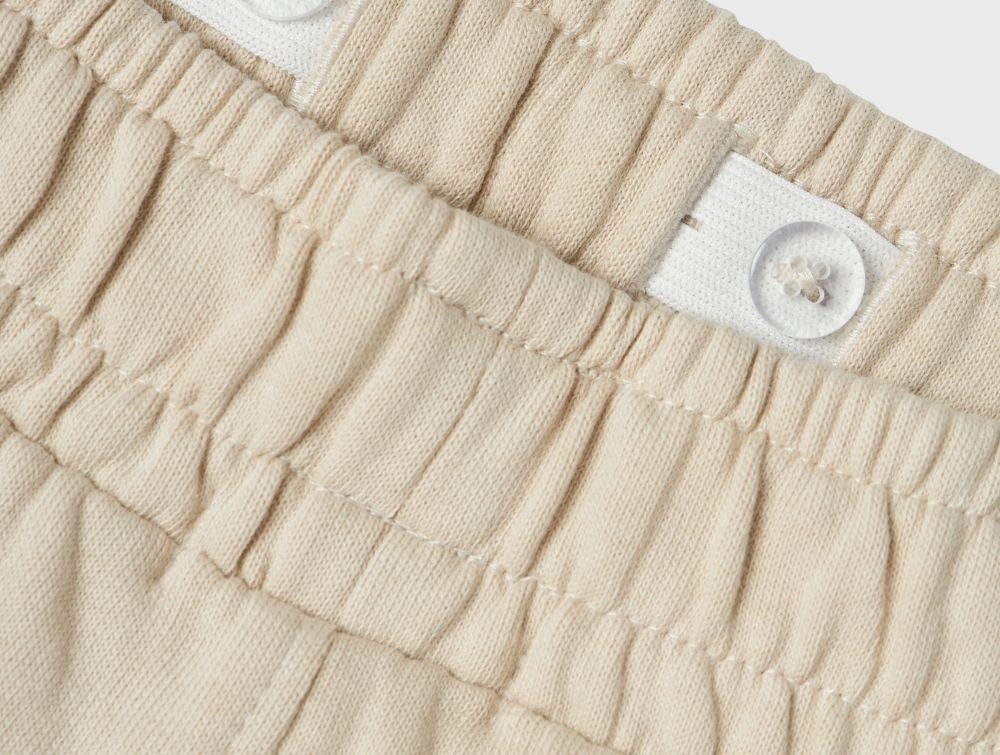 Taljen har justerbar knaphulselastik indvendigt og bindebånd foran for optimal pasform. Fremstillet i ubørstet sweatkvalitet i økologisk bomuld.