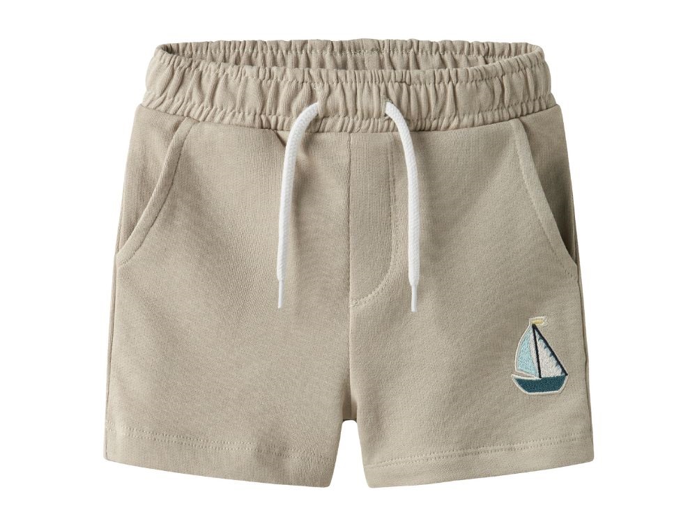 Beige (island fossil) sweatshorts fra Name It med lille broderet båd på det ene ben.