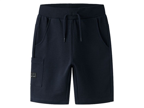 Mørkeblå sweatshorts med lommer fra Name It 13230041 Navy blazerMørkeblå sweatshorts set bagfra med lommer fra Name It 13230041 Navy blazerjusterbar knaphulselastik i linningen på mørkeblå sweatshorts med lommer fra Name It 13230041 Navy blazer
