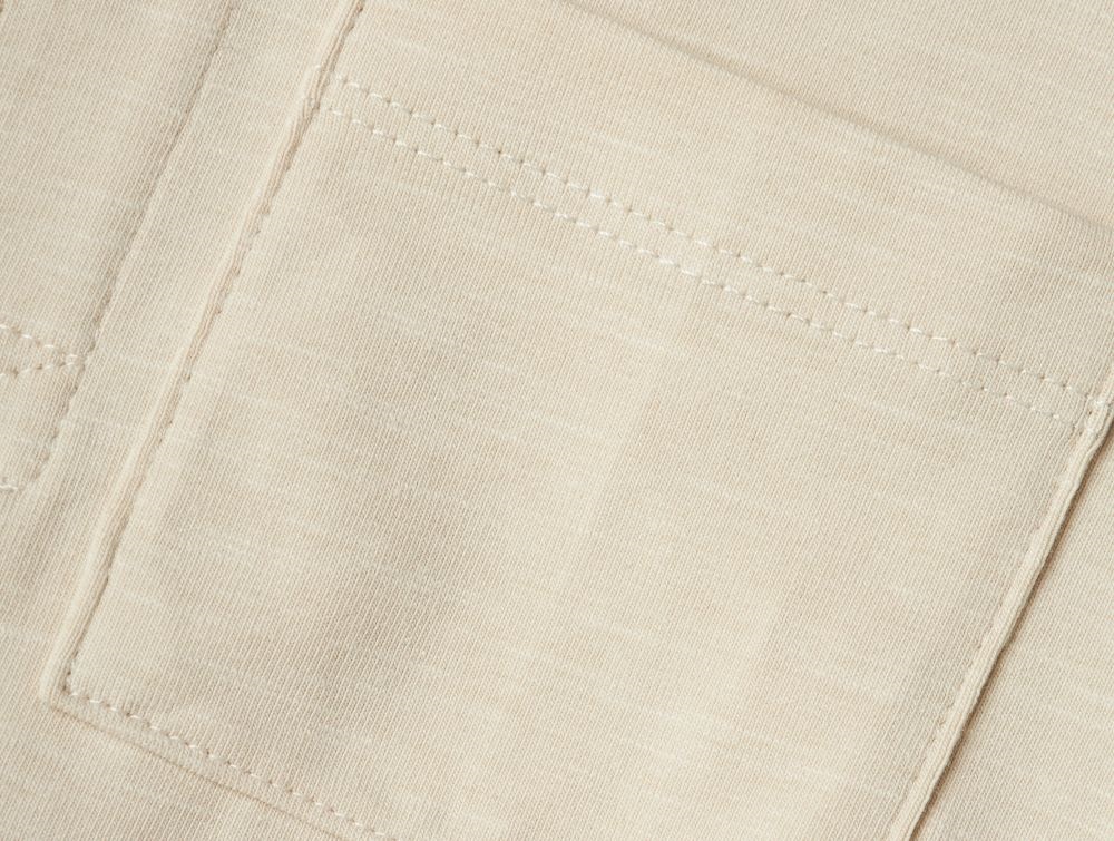 Klassisk t-shirt i beige med brystlomme og rund hals med knaplukning. Modellen har ribkant og korte ærmer, og den tætsiddende pasform gør den velegnet både alene og under andet tøj.