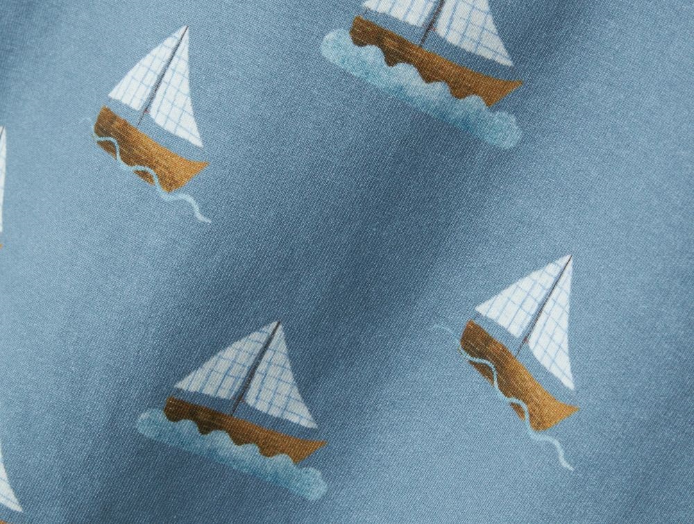 Blød t-shirt i en blå nuance med print af sejlbåde. Modellen har rund hals med ribkant og korte ærmer, og den tætsiddende pasform gør den velegnet både alene og under andet tøj.