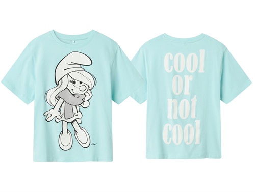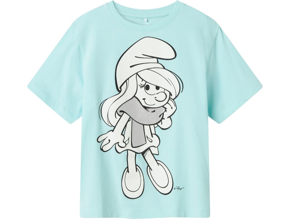 Trendy t-shirt fra Name It i en flot blågrøn nuance med et sjovt print af Smølfine. Lavet i en blød og strækbar kvalitet, der sikrer en behagelig pasform.