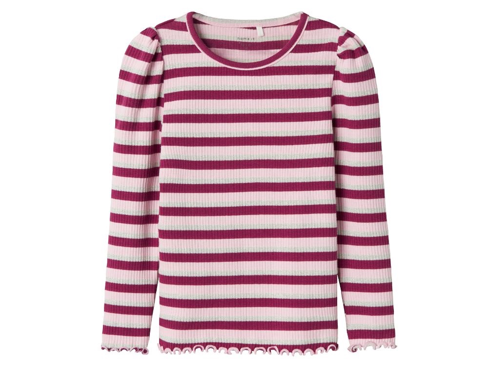 Langærmet t-shirt fra Name It i rosa og bordeaux (boysenberry) striber med bølgede flæsedetaljer og ribstruktur.