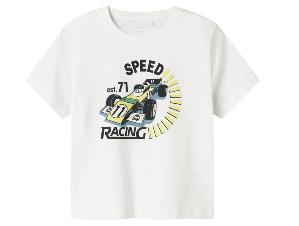 hvid t-shirt fra name it med racerbilprint og teksten speed racingnærbillede af racerbil og tekst på hvid name it t-shirt med print