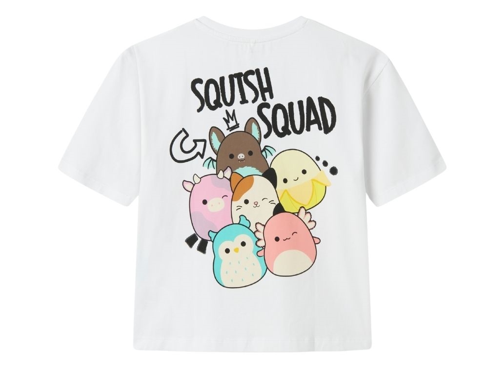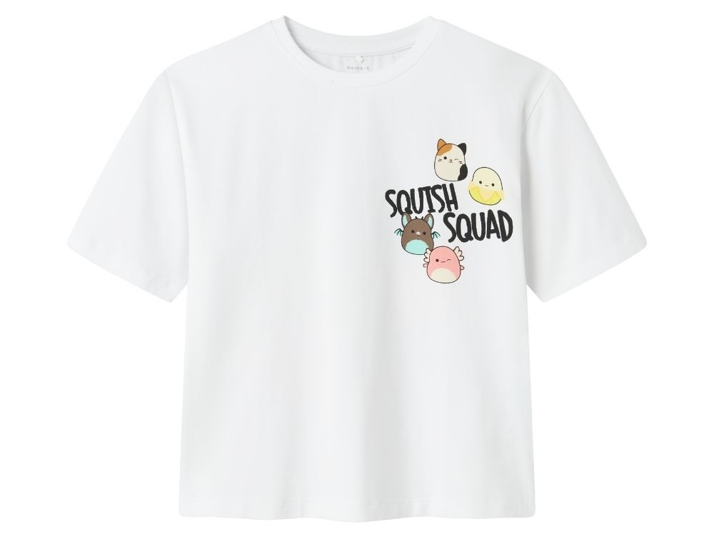 T-shirt i hvid fra Name It med farverigt print af Squishmallows på for- og bagside.