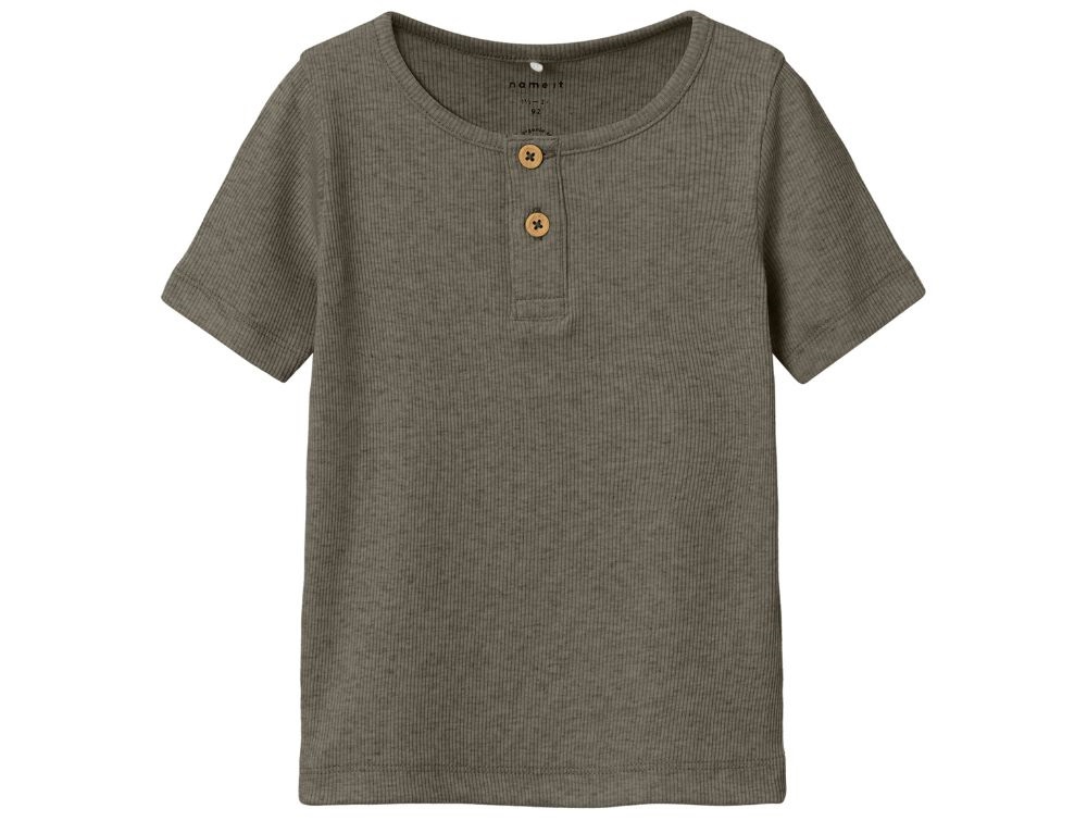 Kortærmet rib t-shirt i bungee cord melange med to knapper ved halsåbning fra Name It.