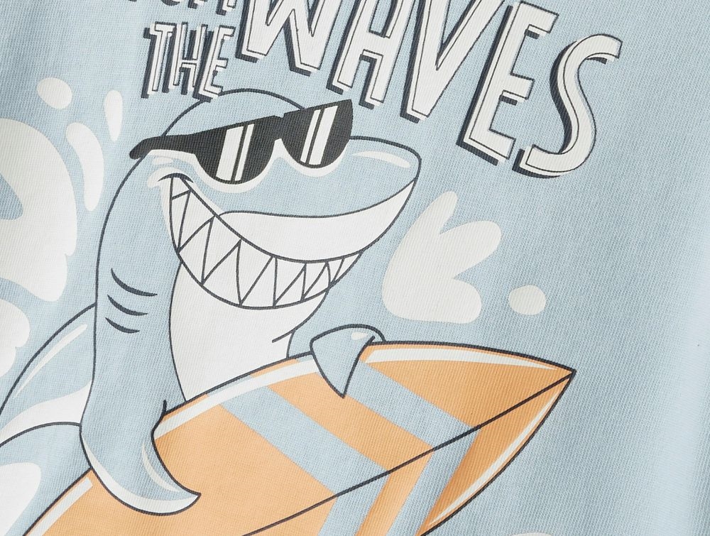 t-shirt fra Name It i lyseblå med haj og surfbrætnærbillede af haj-print med bræt på lyseblå Name It t-shirt