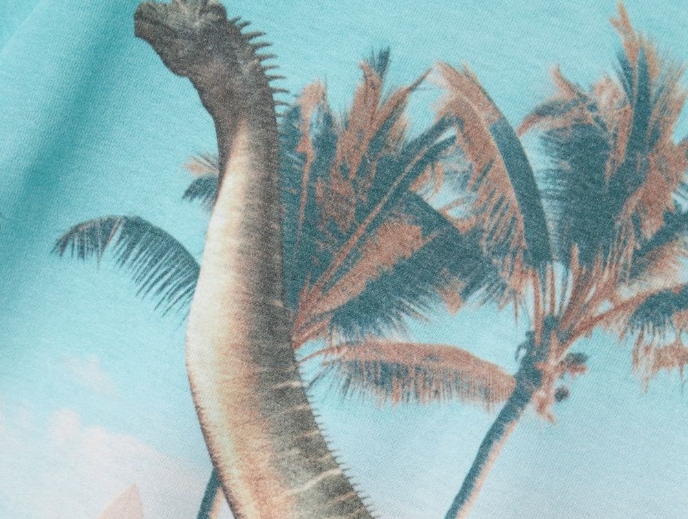 T-shirten har et stort fotoprint på fronten af en dinosaurus ved stranden omgivet af palmer og surfboards. Den er lavet i en blød og let kvalitet med genanvendt polyester og økologisk bomuld, som giver en behagelig pasform til sommerens varme dage.