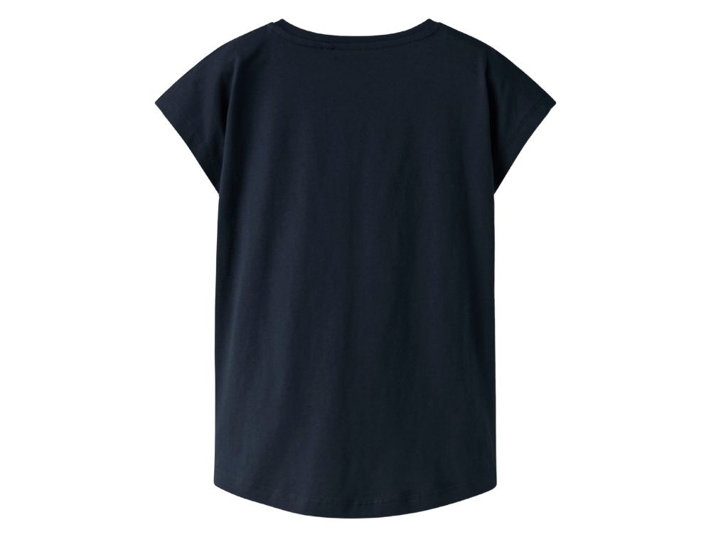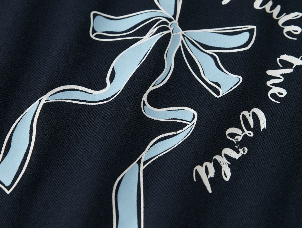 name it t-shirt i mørkeblå med sløjfetryk, set forfraname it t-shirt i mørkeblå uden print, set bagfranærbillede af sløjfetryk på name it t-shirt i mørkeblå