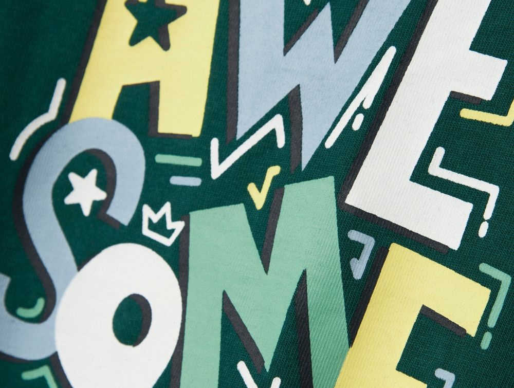T-shirt i mørkegrøn fra Name It med stort print af teksten "AWESOME" i klare farver.