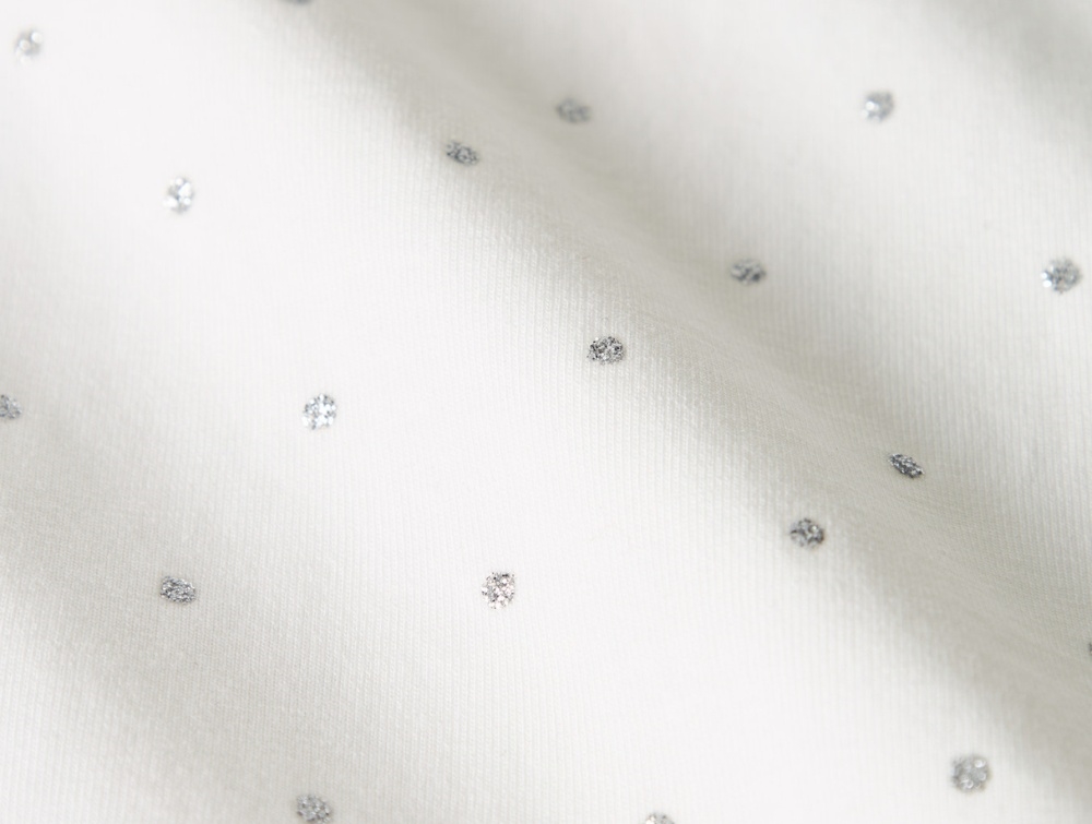 Designet har almindelig pasform, korte ærmer og en rund halsudskæring. Glitterprintet giver en fin prikket overflade med et diskret skinnende udtryk.