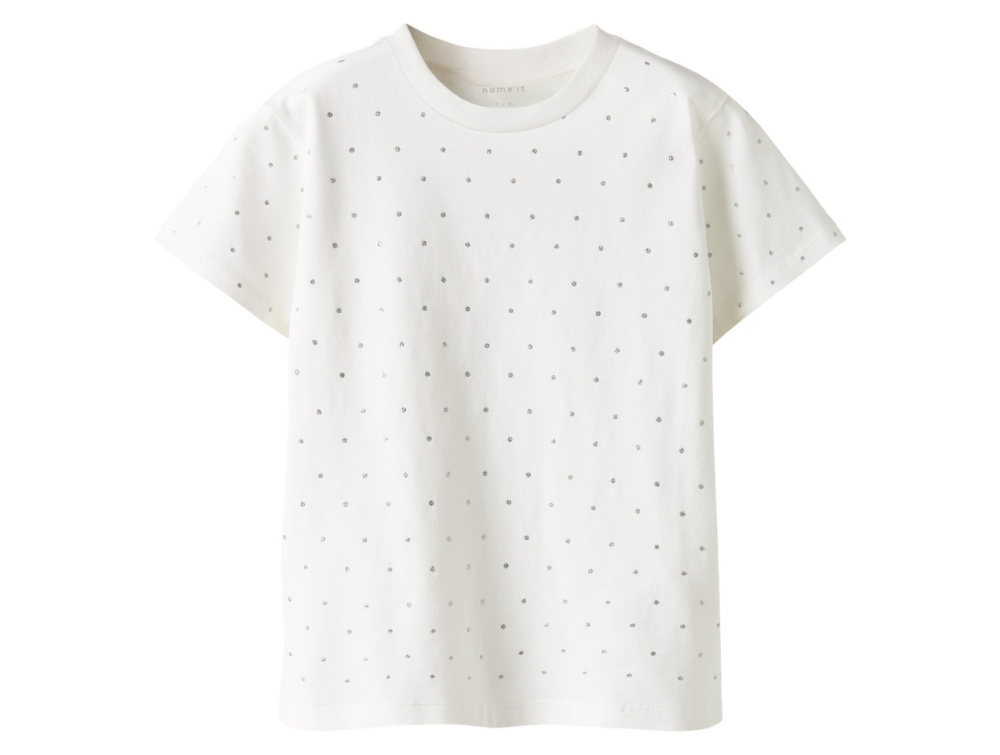 T-shirt i råhvid nuance (bright white) fra Name It. Modellen har korte ærmer, rund hals og små glitterprikker over hele stoffet.