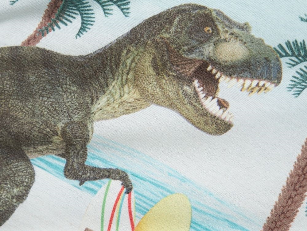 T-shirten har et stort fotoprint på fronten af en tyrannosaurus rex ved stranden omgivet af palmer, badering og surfboards. Den er lavet i en blød og let kvalitet med genanvendt polyester og økologisk bomuld, som giver en behagelig pasform til sommerens varme dage.