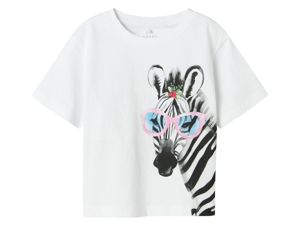 Hvid T-shirt fra Name It med et print på forsiden af en zebra med pink solbriller 13241600 bright whitePrint af en zebra med pink solbriller på hvid Name it T-Shirt 13241600 bright white