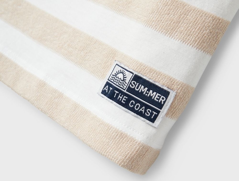 Behagelig t-shirt med striber i hvid og sandfarvet nuance. Modellen har rund hals, korte ærmer og en lille mærkedetalje forneden. Fremstillet i blød og strækbar jerseykvalitet, der giver god bevægelsesfrihed og komfort – oplagt til både hverdag og lidt pænere brug.