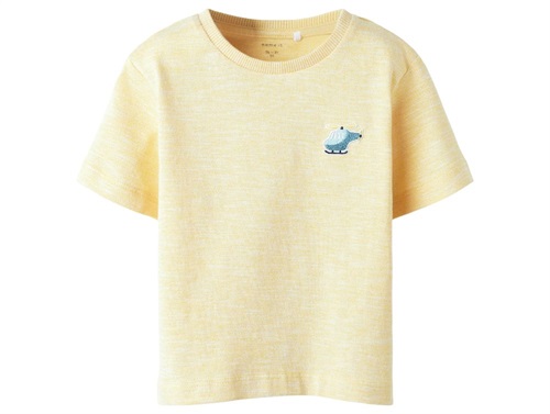 T-shirt fra Name It i gul (buff yellow) med et lille broderet helikoptermotiv på brystet.