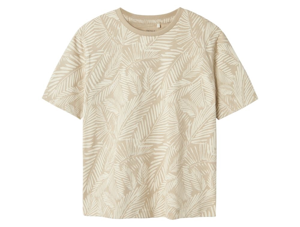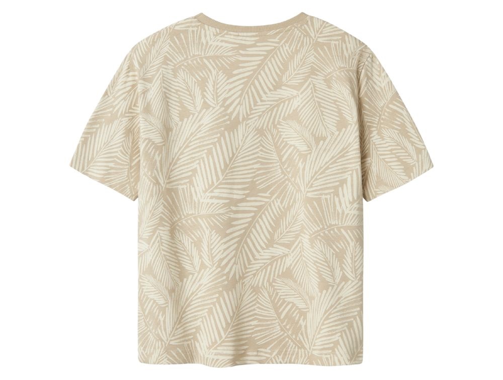 dreng iført name it t-shirt i island fossil med palmeprintname it t-shirt i beige med palmeprint, set forfraname it t-shirt i beige med palmeprint, set bagfranærbillede af palmeprint på name it t-shirt i beige