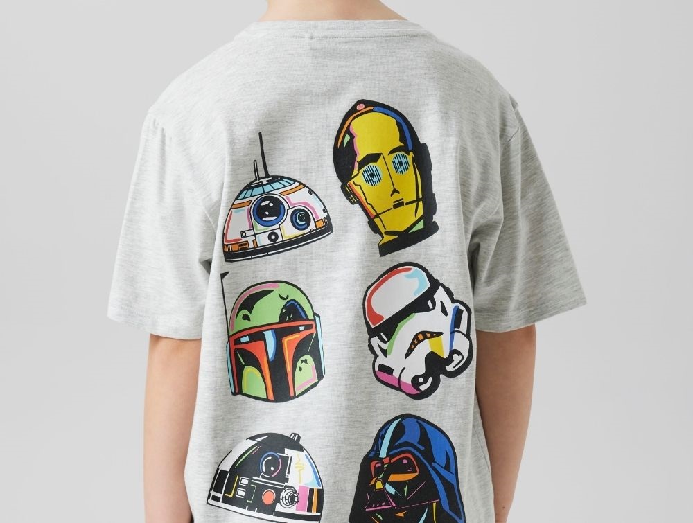 T-shirten har en afslappet pasform, rund hals og korte ærmer. På fronten er der et stort print af C-3PO foran Star Wars-logoet i blåt, og på ryggen ses farverige portrætter af kendte figurer fra Star Wars-universet såsom R2-D2, Darth Vader og en Stormtrooper.