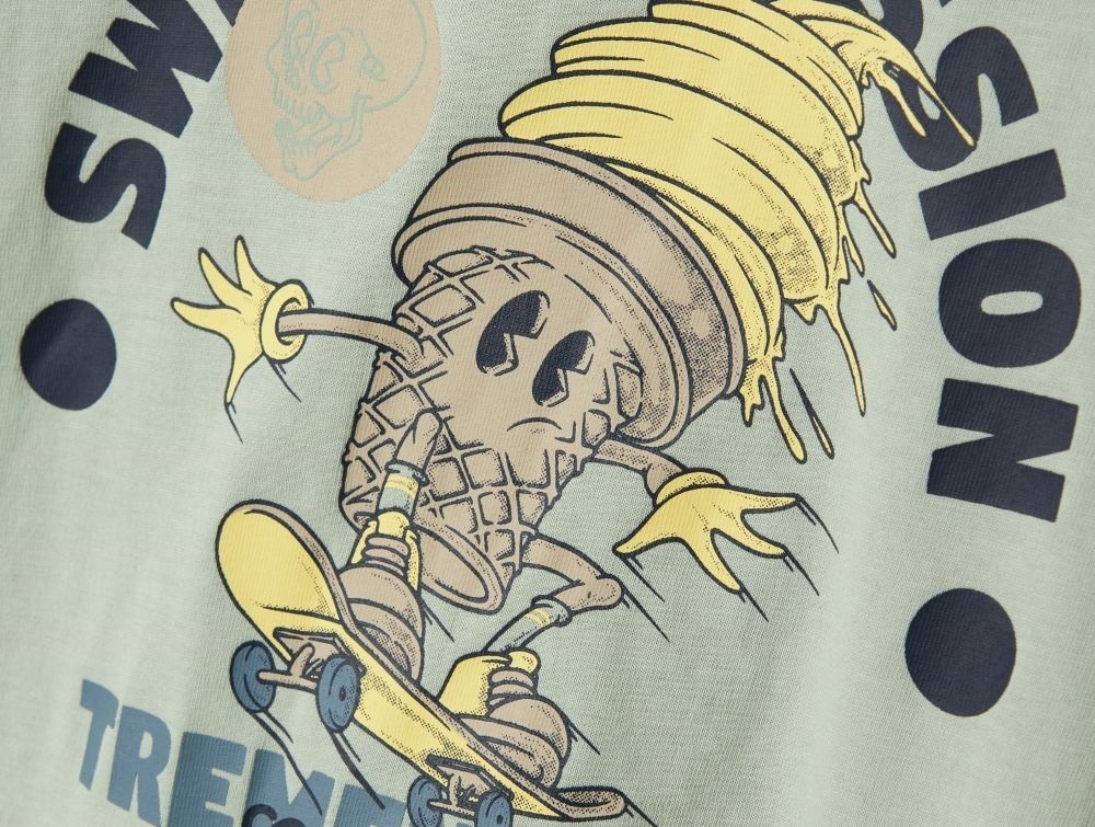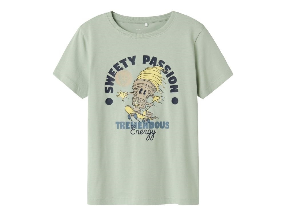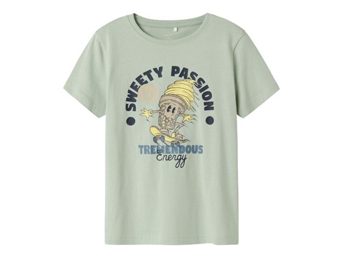 Lysegrøn t-shirt med en vaffelis på skateboard printet på forsiden fra Name It 13242809 aqua grayLysegrøn t-shirt fra Name It 13242809 aqua grayMotiv af en vaffelis på skateboard printet på en lysegrøn t-shirt fra Name It 13242809 aqua gray