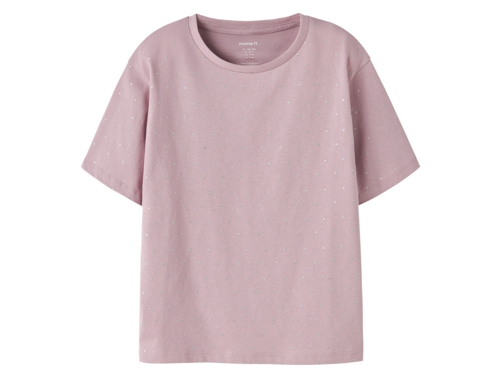 T-shirt i lyserød nuance (keepsake lilac) fra Name It. Modellen har korte ærmer, rund hals og små glitterprikker over hele stoffet.