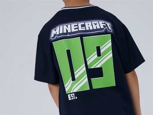 Marineblå t-shirt i let og åndbar mesh-kvalitet med gummiprint af Minecraft på både front og ryg. Modellen har V-hals, korte ærmer og en almindelig pasform. Fremstillet i 100% polyester, som føles let mod huden og tørrer hurtigt – perfekt til aktive børn, der elsker Minecraft-universet.