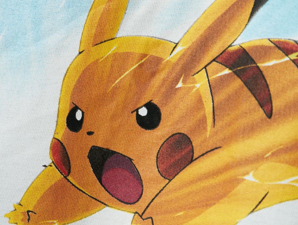 T-shirten har en afslappet pasform, korte ærmer og rund hals. På fronten ses et stort farverigt print af Pikachu i fuld fart omgivet af en lyseblå energi-effekt. Perfekt til små fans af Pokémon-universet og til hverdagsbrug.