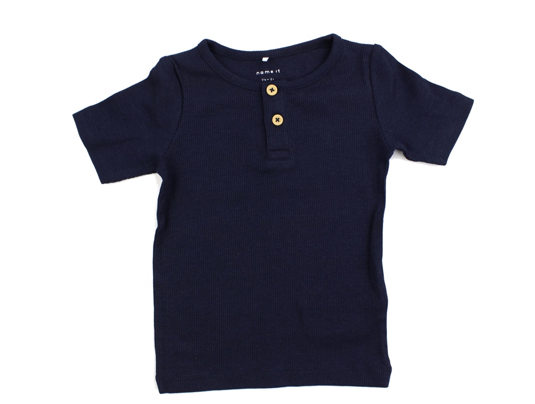 Kortærmet rib t-shirt i mørkeblå (dark sapphire) med to knapper ved halsåbning fra Name It.