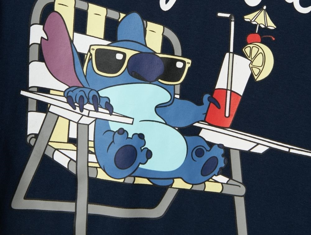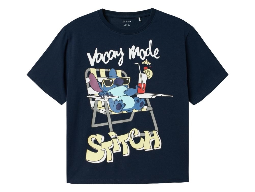 T-shirten har en afslappet pasform, korte ærmer og er lavet i en blød og strækbar jerseykvalitet, som giver god komfort og bevægelsesfrihed. Printet viser Stitch i feriehumør, der skaber et sjovt og legende udtryk.