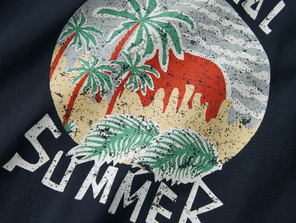 T-shirten har korte ærmer, rund hals og et farverigt print af solnedgang, strand og palmer med teksten "tropical Summer".