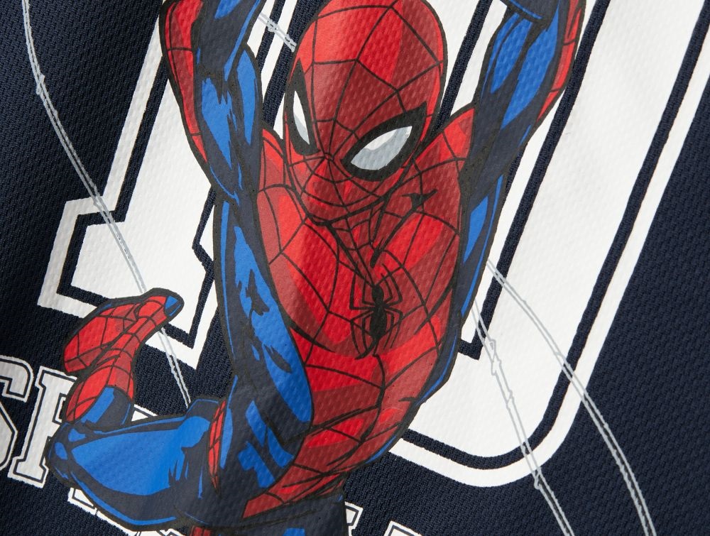Kortærmet bluse i en flot mørkeblå nuance med print af den velkendte Spiderman-figurpå brystet og ryggen. Modellen har et sporty udtryk med V-hals og korte ærmer med stribet ribkant.