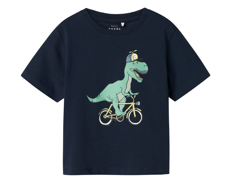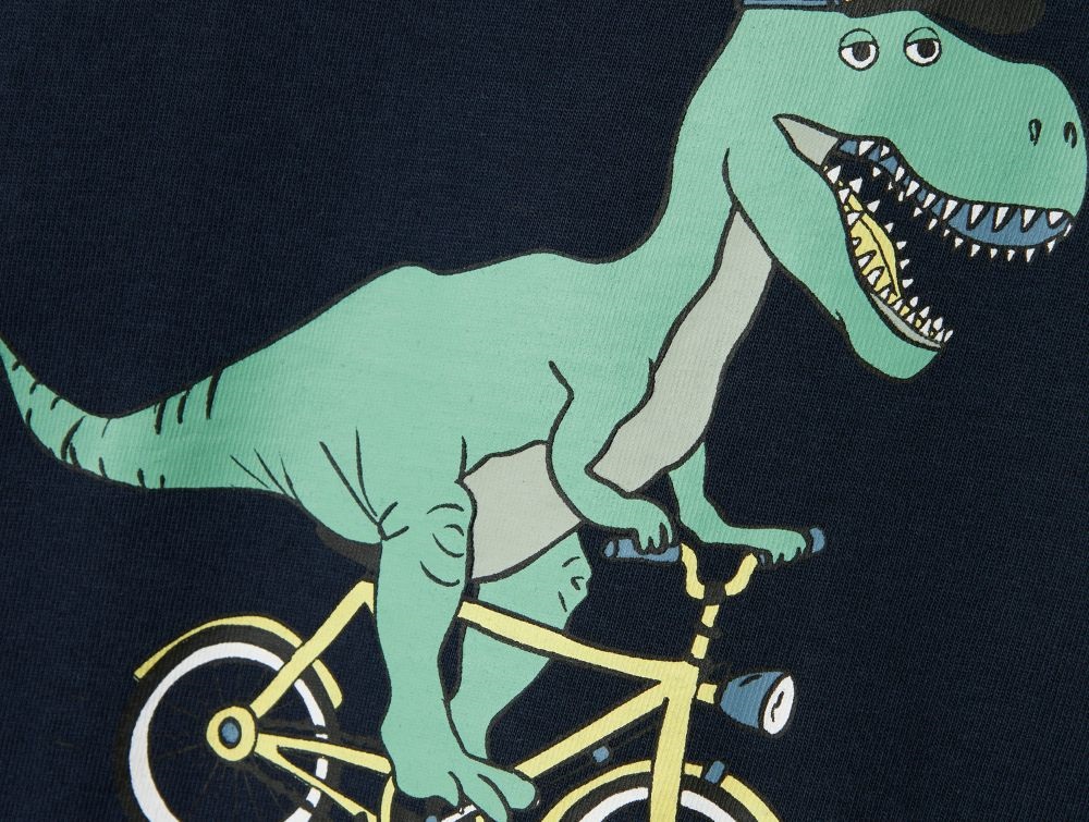 T-shirt i mørkeblå fra Name It med stort print af en grøn dinosaur på cykel med rød kasket og solbriller.