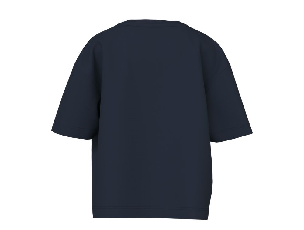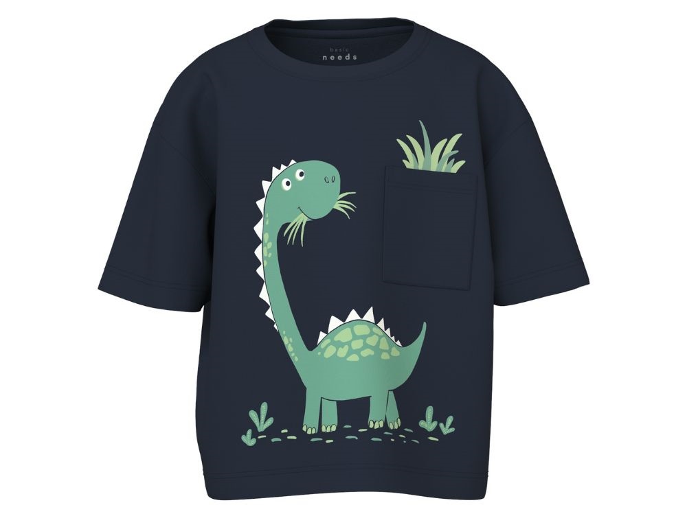 mørkeblå t-shirt fra name it med stor dino og lommeprint foranbagside af mørkeblå t-shirt fra name it uden print