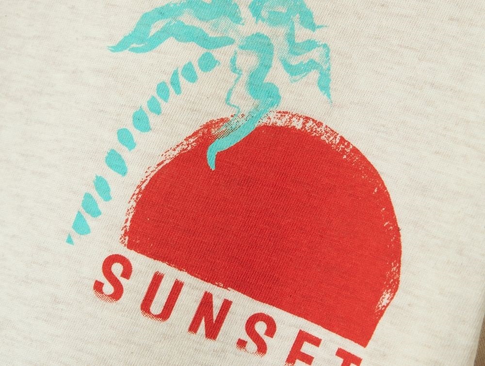 Beige t-shirt med stemningsfuldt print af solnedgang foran og bagpå. Modellen har rund hals, korte ærmer og en afslappet pasform. T-shirten er lavet i blød og strækbar jerseykvalitet af økologisk bomuld, som sikrer god komfort og bevægelsesfrihed i hverdagen.