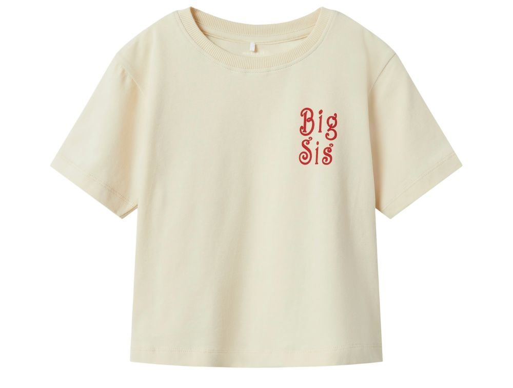 T-shirt i råhvid (white swan) med storesøster-print fra Name It.
