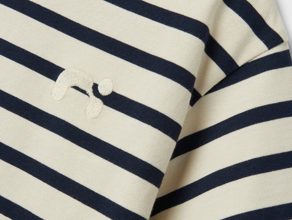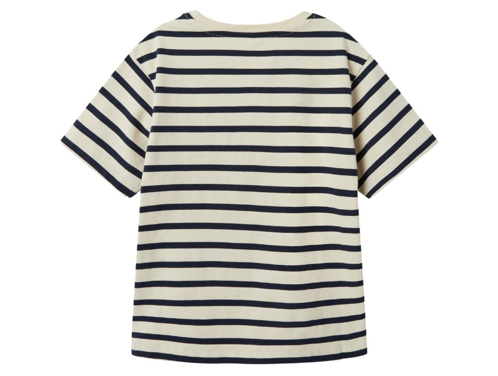 Råhvid t-shirt med mørkeblå striber og logobroderi fra name It Kids 13240705 white swanRåhvid t-shirt med mørkeblå striber fra name It Kids 13240705 white swan bagfralogobroderi på råhvid t-shirt med mørkeblå striber fra Name It 13240705 white swan