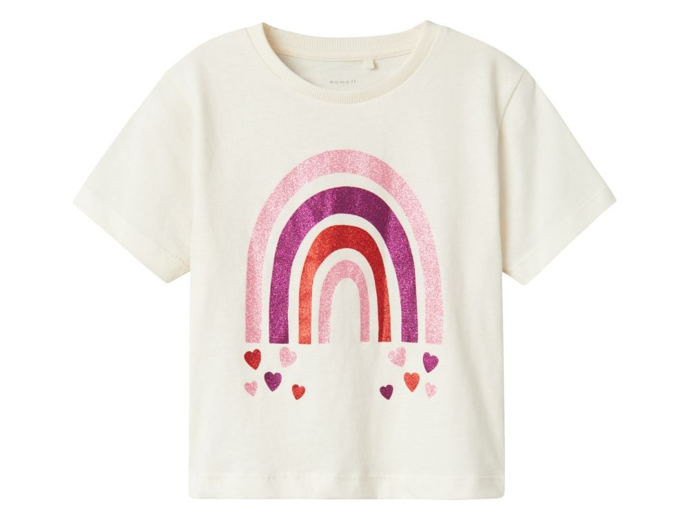 T-shirt fra Name It i råhvid (sea salt) med glimmer regnbue.